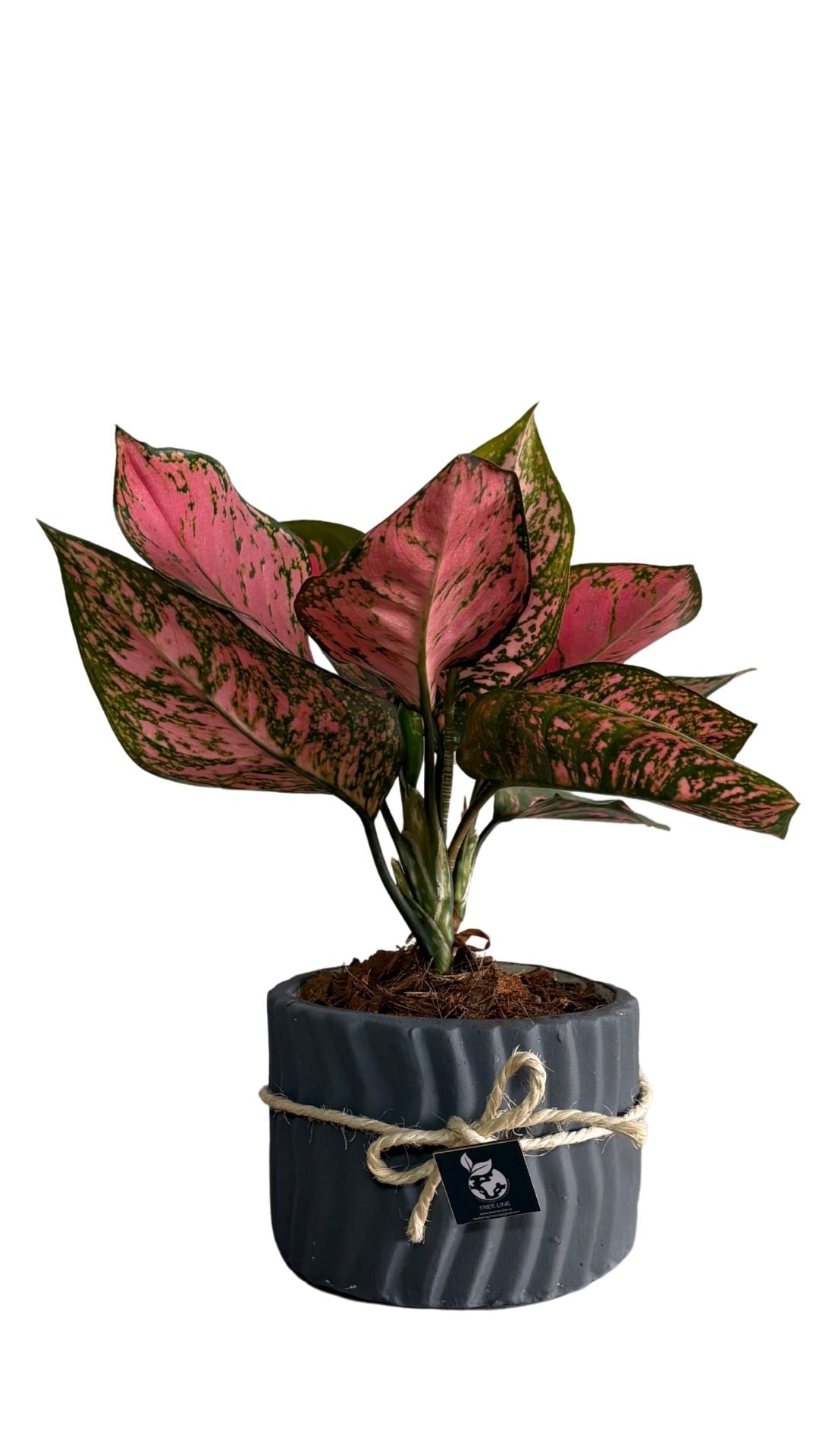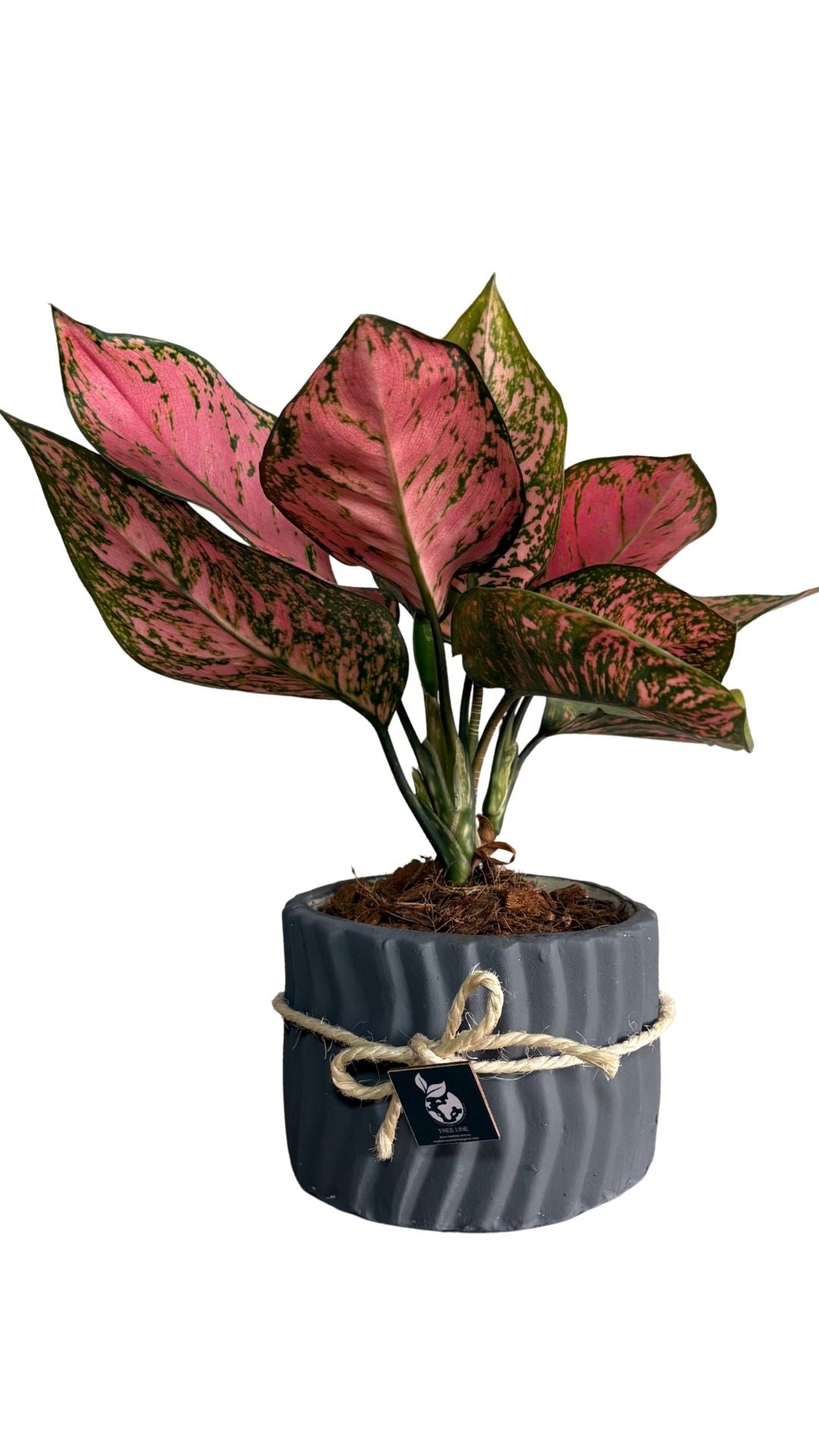 Matera artesanal en barro blanco con lineas en zigzag Muy parecida a Aglaonema en formas y colores, con follaje verde brillante y moteado. Se confunde con aglaonemas por su apariencia similar y también tolera luz baja.