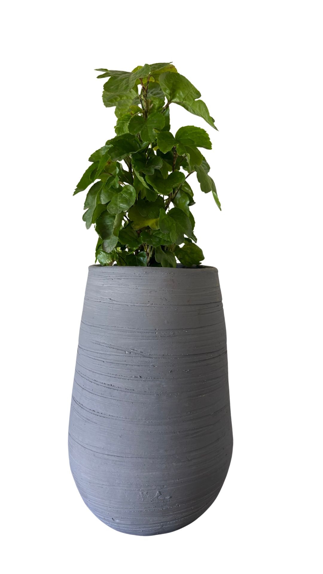 Matera artesanal en barro blanco en forma de gota alargada La planta millonaria es una planta ornamental de interior apreciada por su follaje verde y exuberante. Sus hojas son ovadas con bordes suaves, de color verde brillante, lo que la hace ideal como planta colgante o de repisa.