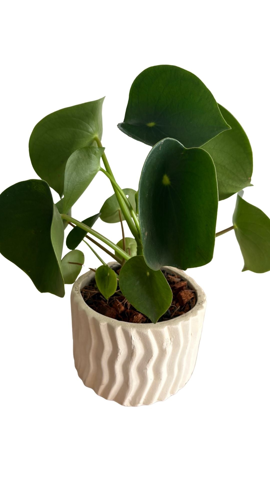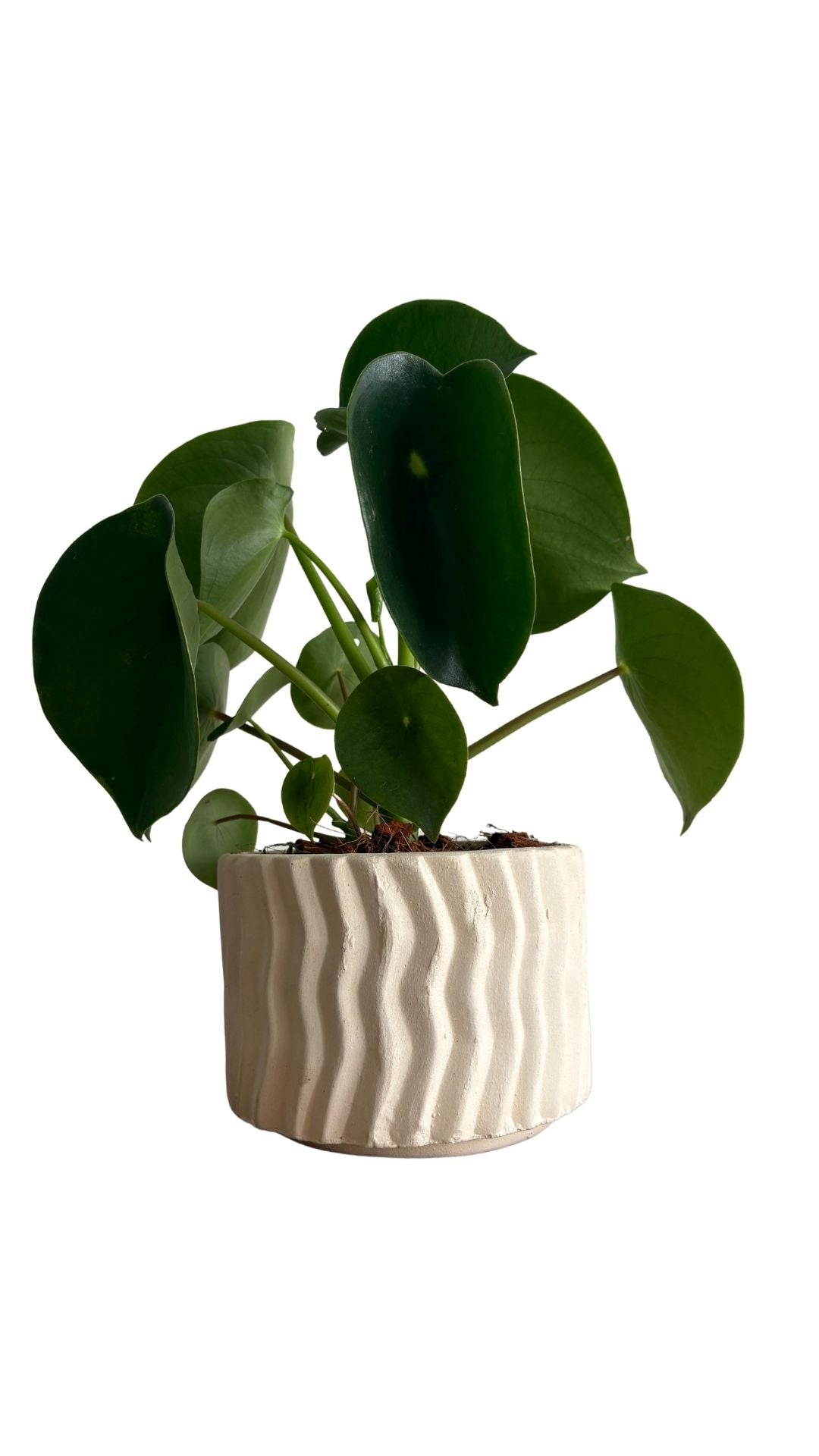 Matera artesanal en barro blanco con lineas en zigzag. La planta cucharita, conocida por sus hojas carnosas, redondas y cóncavas que recuerdan a pequeñas cucharas, ideal para interiores por su fácil cuidado, que requiere luz indirecta brillante y riego moderado, dejando secar la tierra entre riegos para evitar pudrición, siendo segura para mascotas y simbolizando prosperidad.