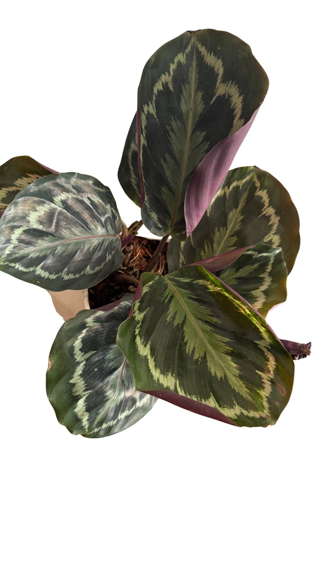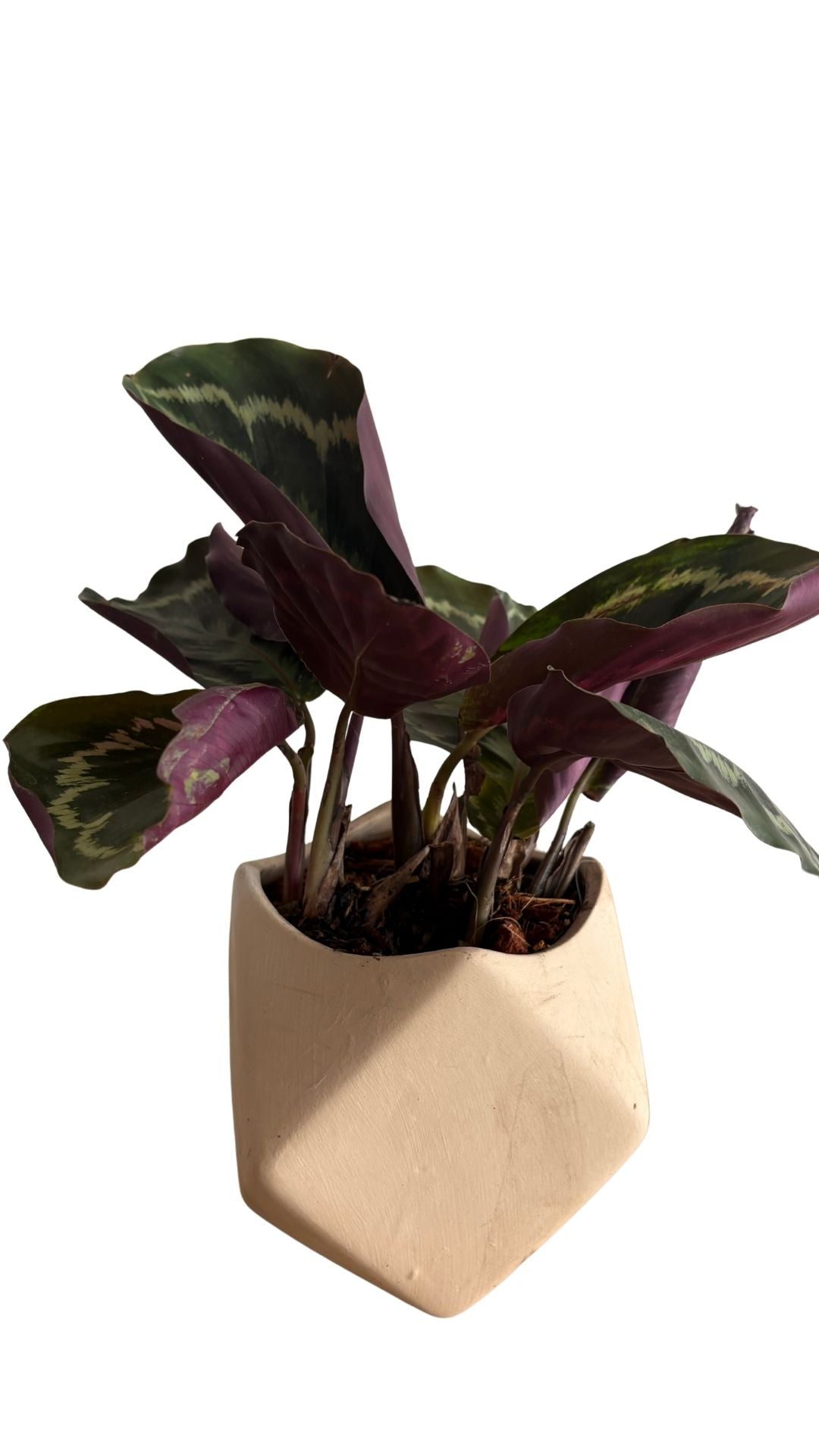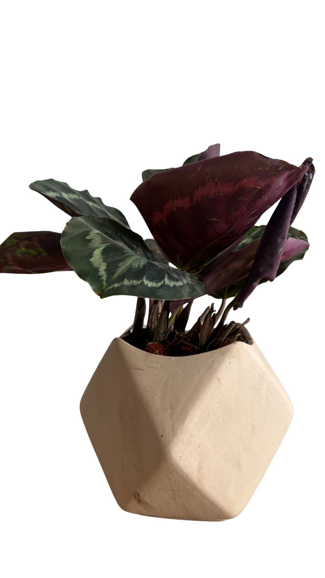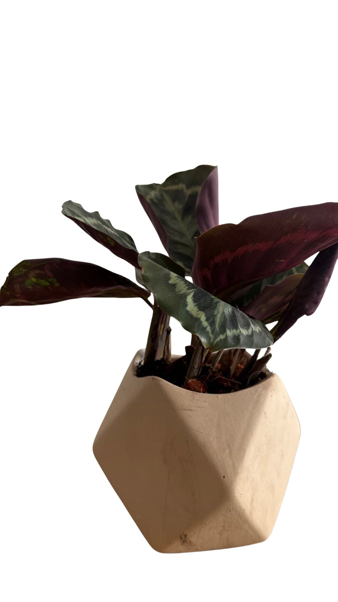 Matera artesanal con varias caras Follaje con manchas rosadas sobre verde oscuro, llamativo y colorido.