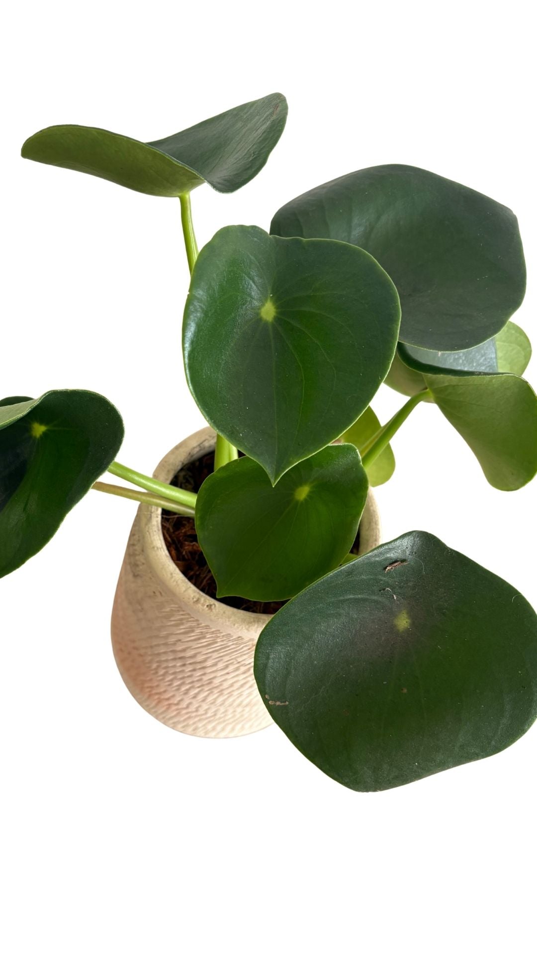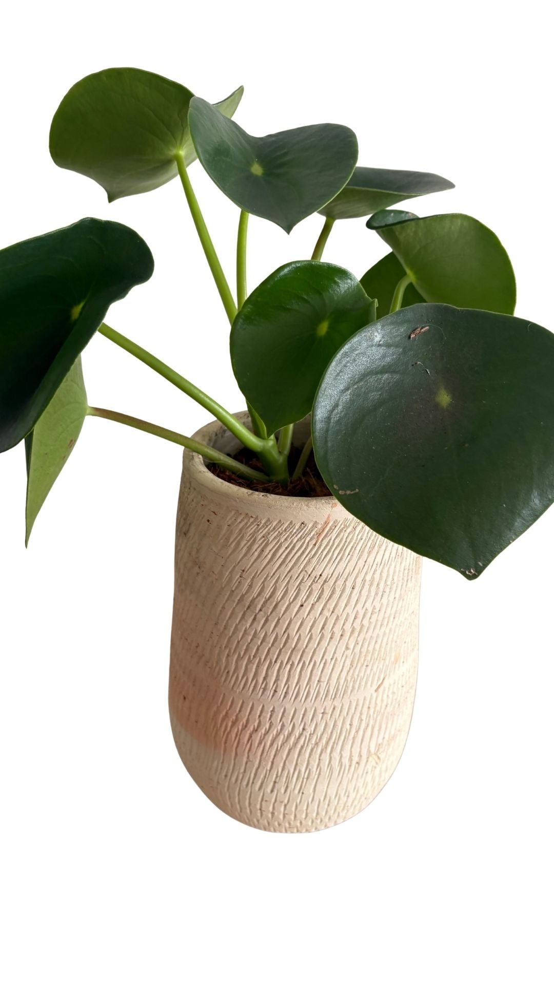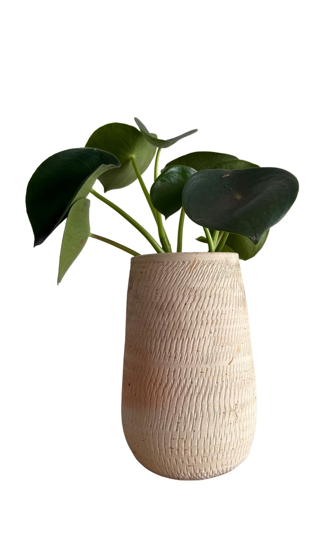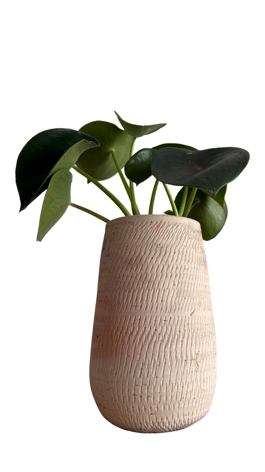 Matera artesanal en barro blanco en forma de gota alargada La planta cucharita, conocida por sus hojas carnosas, redondas y cóncavas que recuerdan a pequeñas cucharas, ideal para interiores por su fácil cuidado, que requiere luz indirecta brillante y riego moderado, dejando secar la tierra entre riegos para evitar pudrición, siendo segura para mascotas y simbolizando prosperidad.